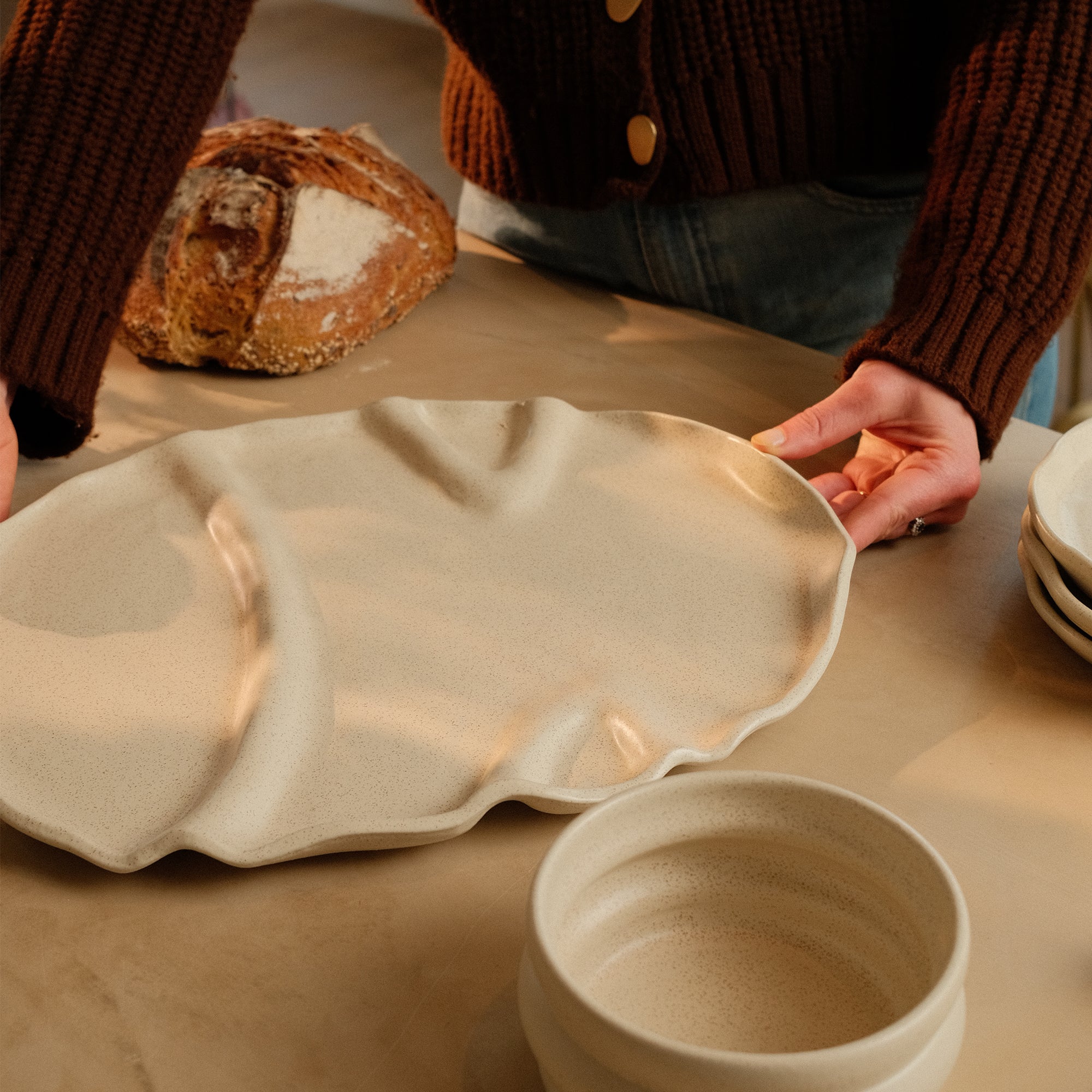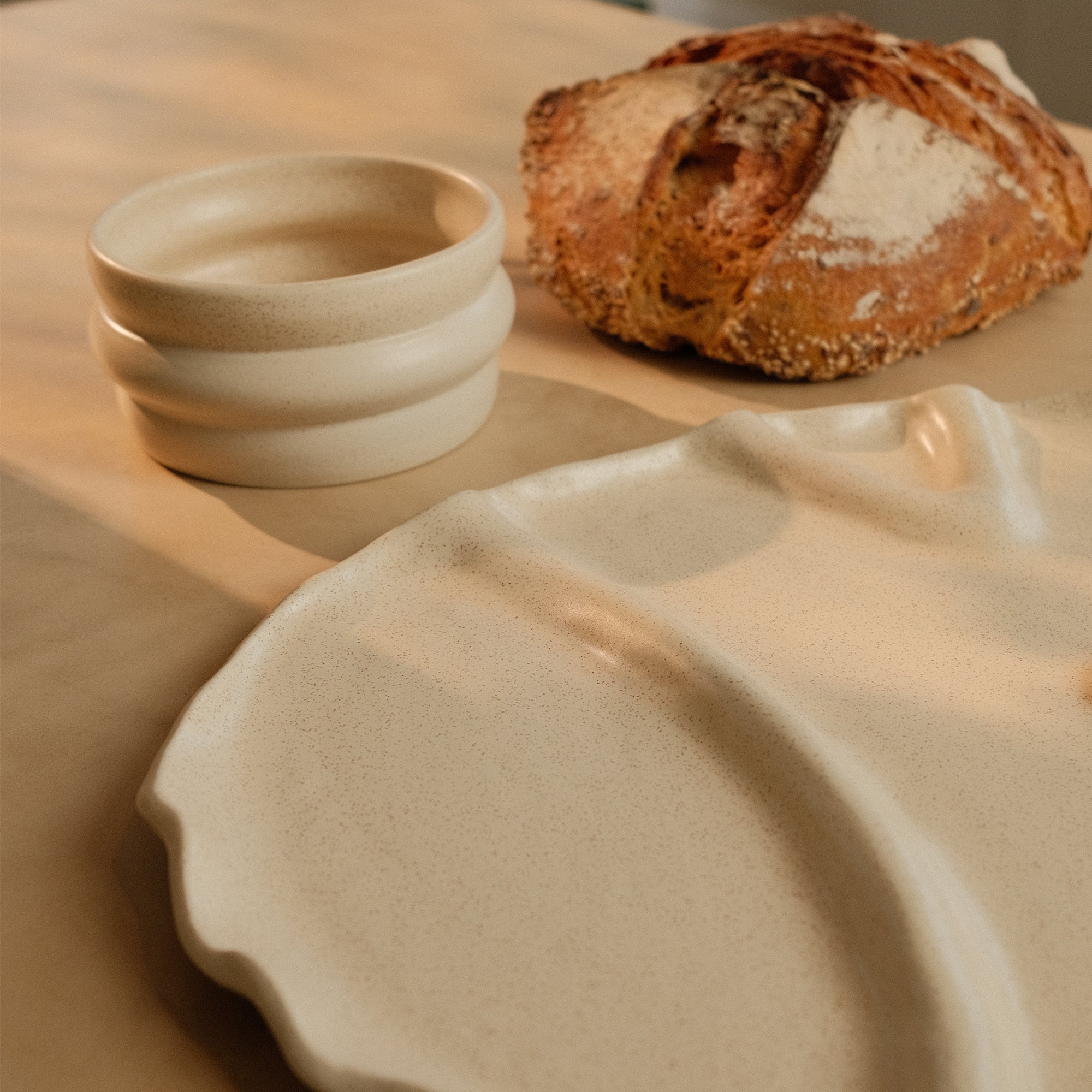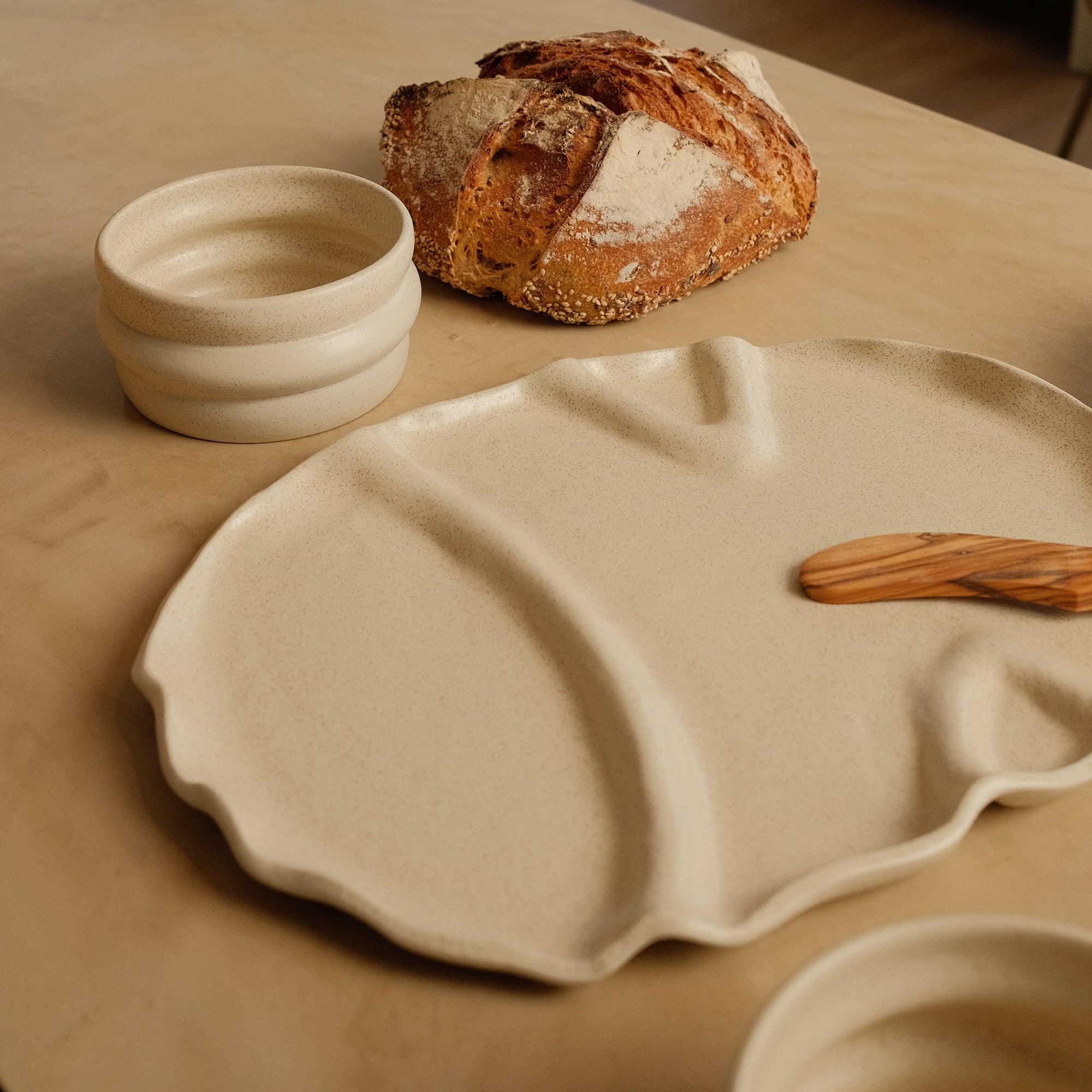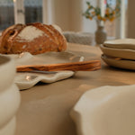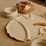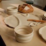 De snackschaal van Mento x Veggilaine vormt het hart van de Douro-collectie. Een unieke handgemaakte schaal met organische vormen, vloeiende lijnen, een matte beige tint en subtiele spikkel.